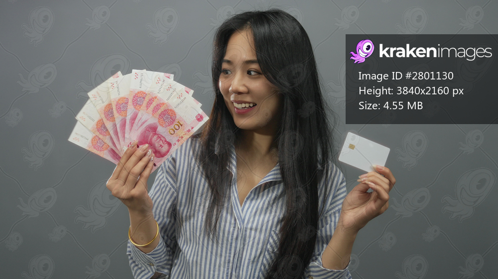 Woman holding chinese yuan banknotes and a credit card against an isolated grey background, showcasing financial prosperity and modern banking concepts. - Kraken Images