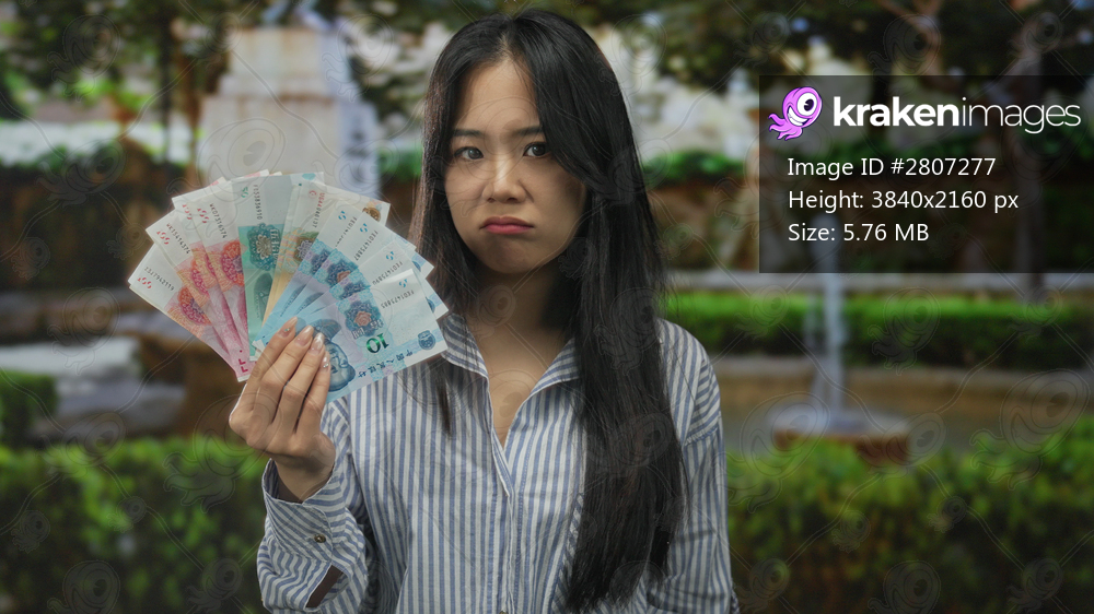 Woman holding chinese yuan banknotes in park showcasing money management outdoors with green nature background