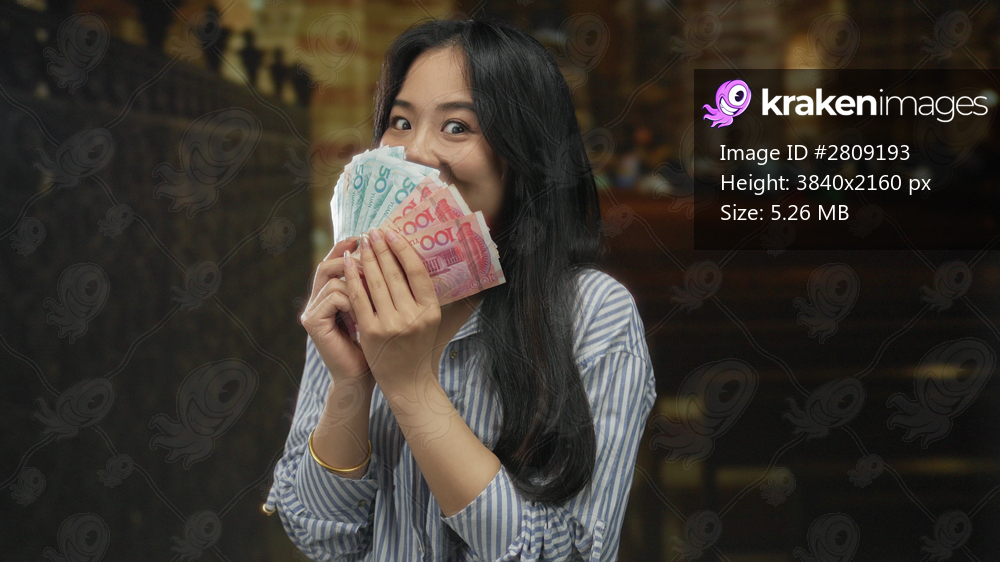Woman holding chinese yuan banknotes inside church highlights financial concept amid religious setting indoors with joyful expression.