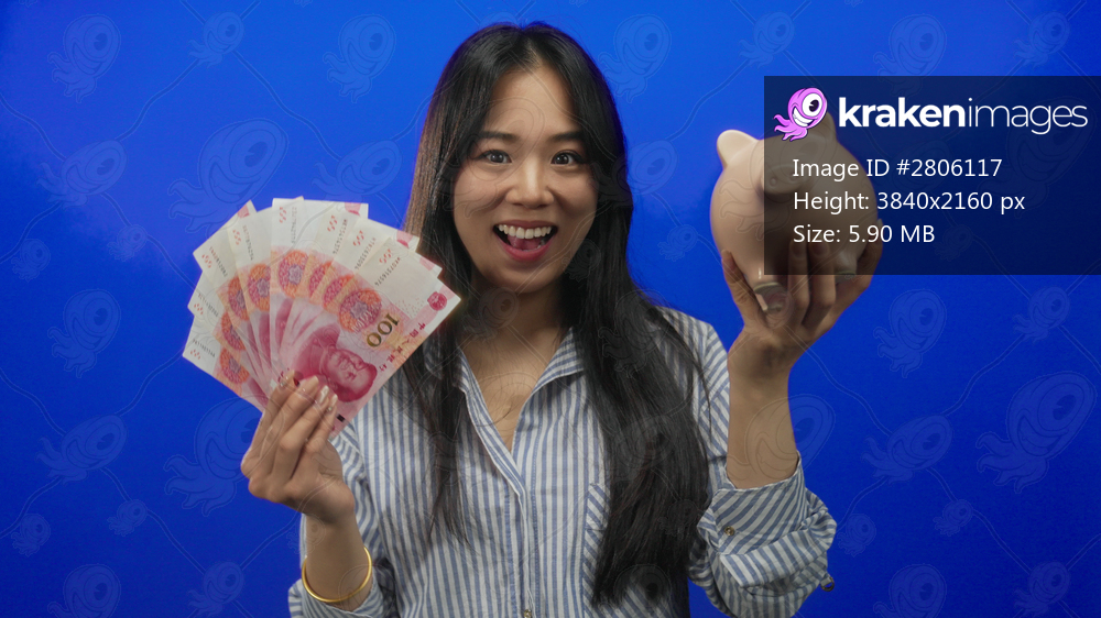 Woman holding chinese yuan and piggy bank against blue background, illustrating savings and financial security.
