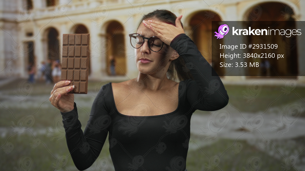 Woman holding chocolate bar in building courtyard with hand to forehead and closed eyes grimace; taste rejection disgust.