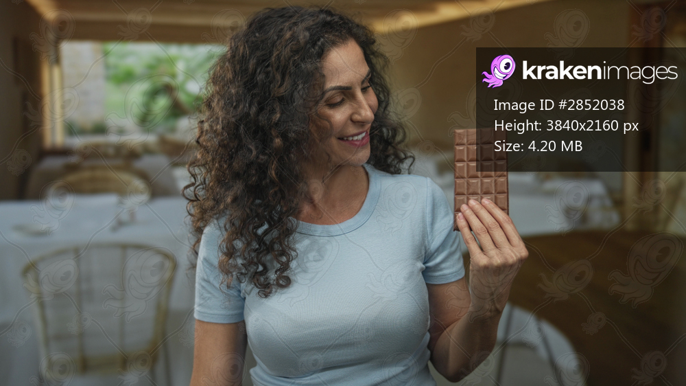 Woman holding chocolate bar in restaurant interior and smiling gently with curly hair and casual posture; happiness.
