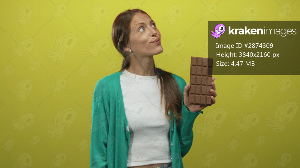 Woman holding chocolate bar with one hand, wearing green cardigan and white crop top in yellow studio; playful craving.
