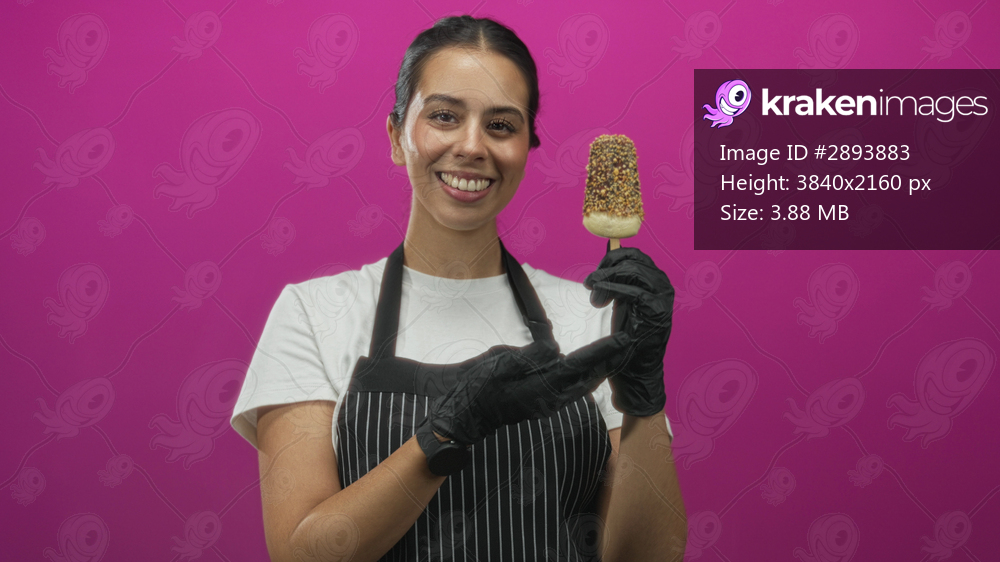 Woman holding chocolate coated ice cream popsicle while wearing a striped apron and black gloves in pink studio; sweet treat joy.