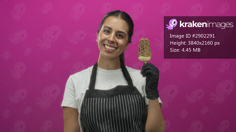 Woman holding chocolate coated ice cream popsicle while wearing a striped apron and black gloves in pink studio; sweet treat joy.