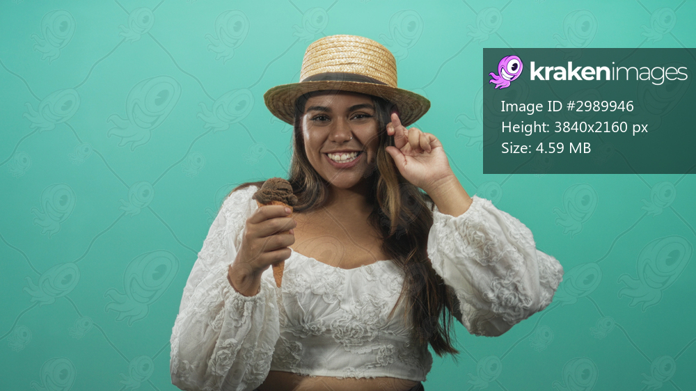 Woman holding chocolate icecream cone, licking tongue and pinching her eye while wearing straw hat and white crop top in studio; playful delight.