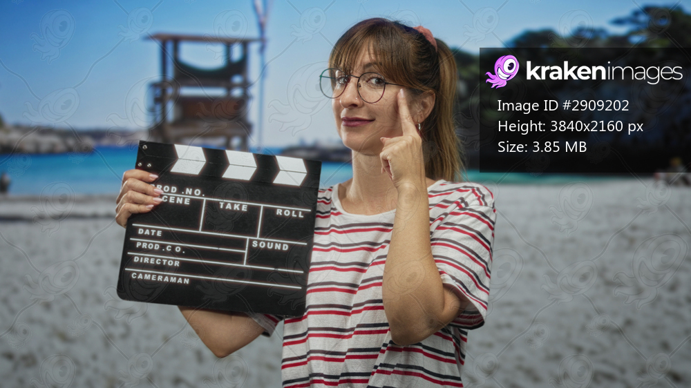 Woman holding clapperboard and pointing finger to camera in studio with beach backdrop, wearing striped tshirt and glasses; playful creativity.