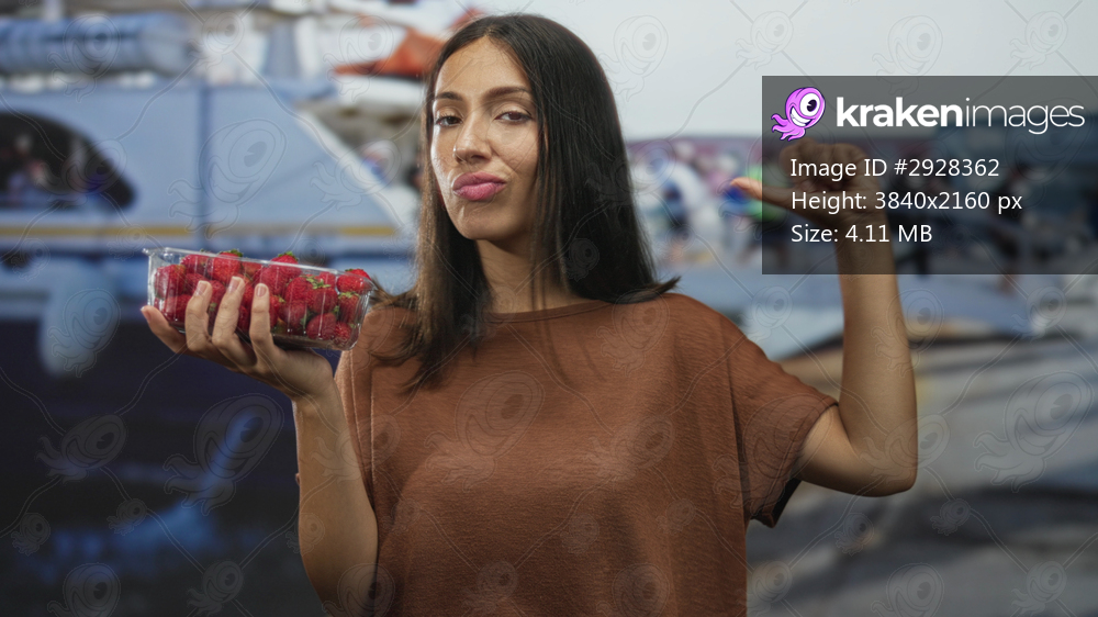 Woman holding clear plastic container of strawberries, thumb pointing to self at airport terminal; indifference healthy choice.