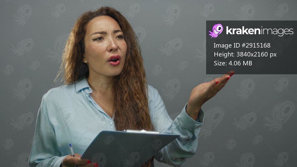 Woman holding clipboard and pen gestures with raised hand while reading notes in studio; concern concentration.