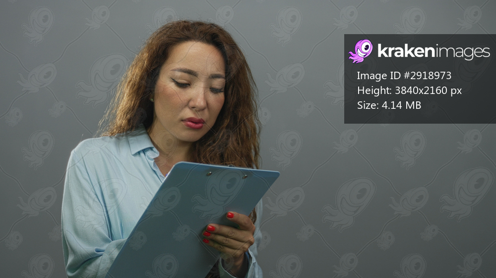 Woman holding clipboard and pen gestures with raised hand while reading notes in studio; concern concentration.