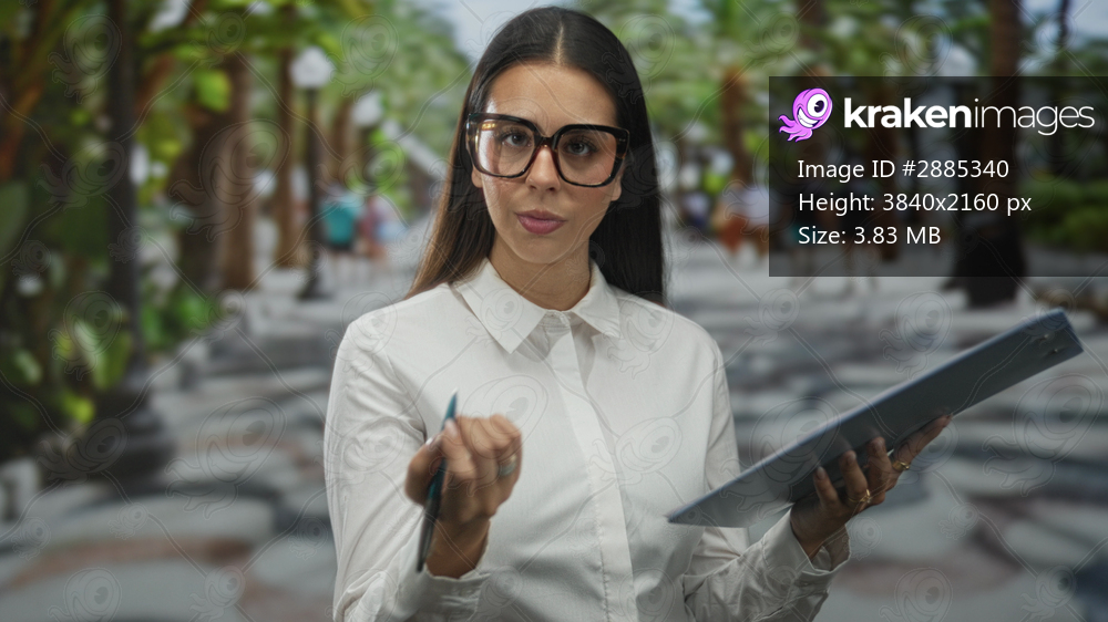 Woman holding clipboard and pen, hand extended offering pen while wearing glasses and white shirt in street; professional focus.