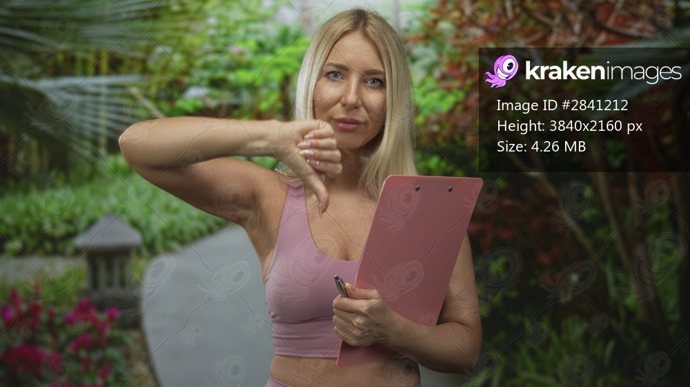 Woman holding clipboard and pen makes thumbs down gesture with direct gaze on green park pathway; rejection.