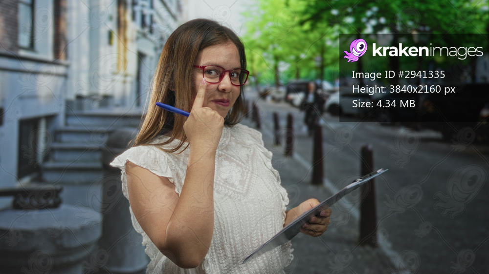 Woman holding clipboard and pen pointing finger to glasses on a city street sidewalk near parked cars; confidence focus.