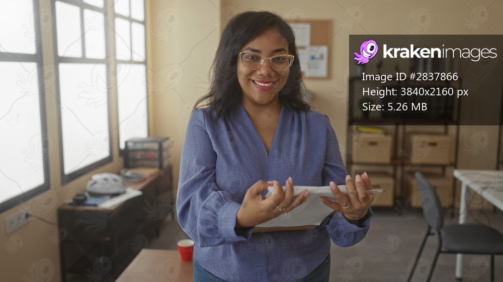 Woman holding clipboard and pen reading financial notes in office wearing blue blouse bathed in soft natural light; focus.