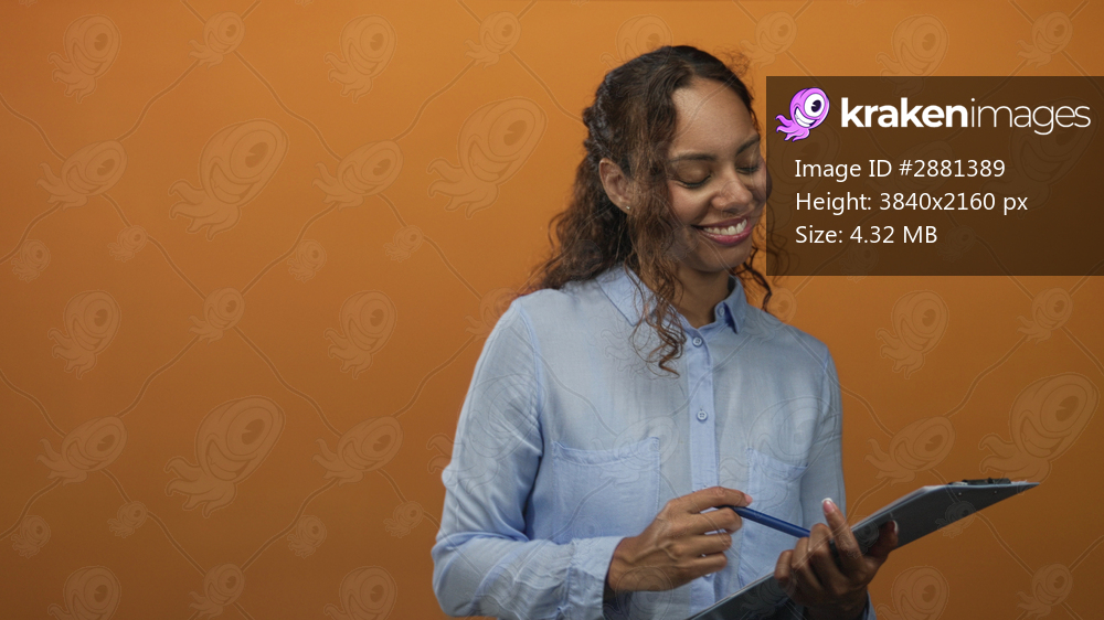 Woman holding clipboard and pen, smiling with eyes closed in studio with orange backdrop; thoughtful planning.