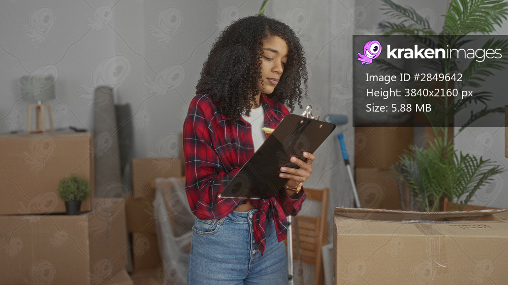 Woman holding clipboard and pen while checking cardboard box in building; efficiency and concentration.