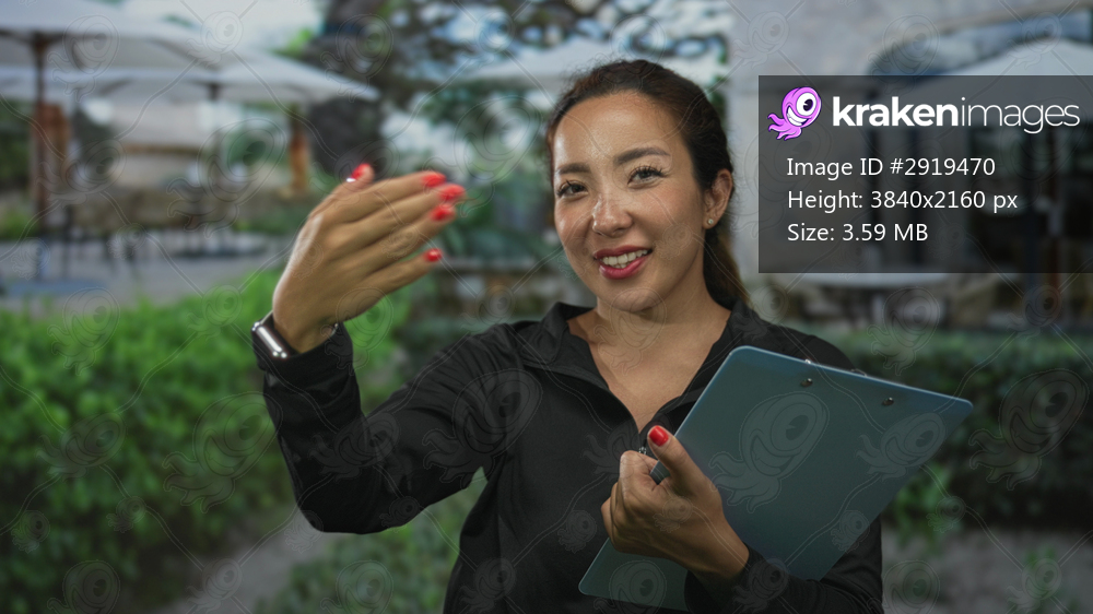 Woman holding clipboard and points finger to chest in outdoor building courtyard while smiling and speaking to camera; confidence communication.