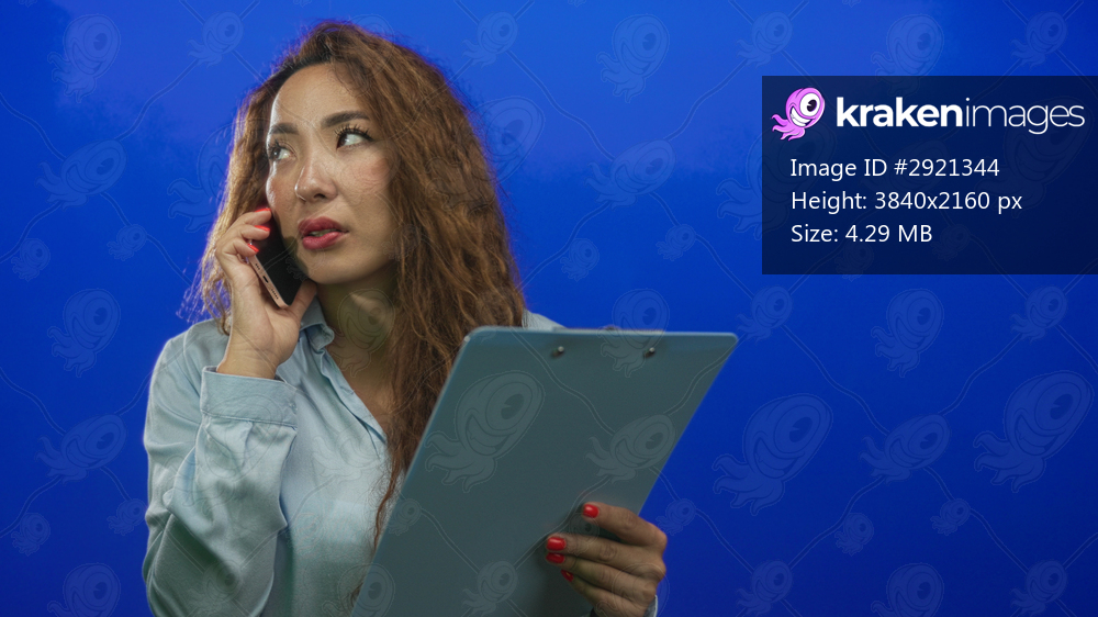 Woman holding clipboard and smartphone, reading notes while speaking on phone in blue studio; urgent concern.