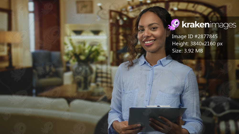 Woman holding clipboard and smiling while reading notes in a living room set inside a building; confidence helpful guidance.
