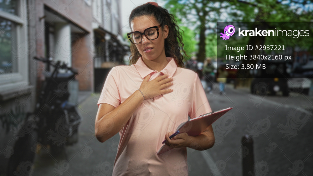Woman holding clipboard wearing glasses and hand on chest on street with bike and building visible; concern health.