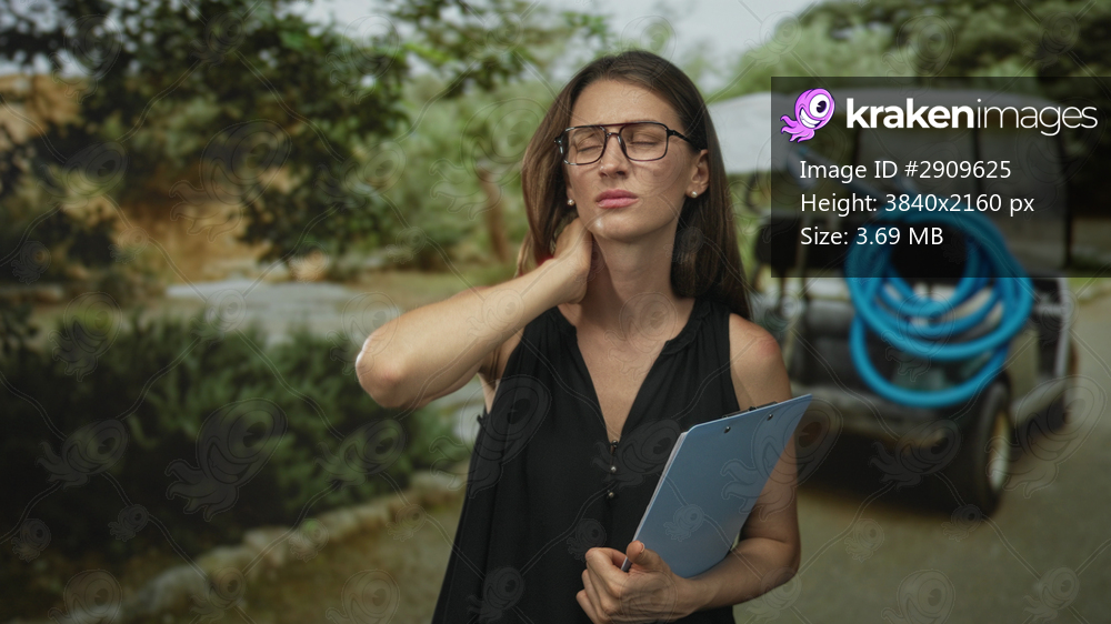 Woman holding clipboard and wearing glasses, hand on neck for neck pain on street near golf cart; discomfort work stress.