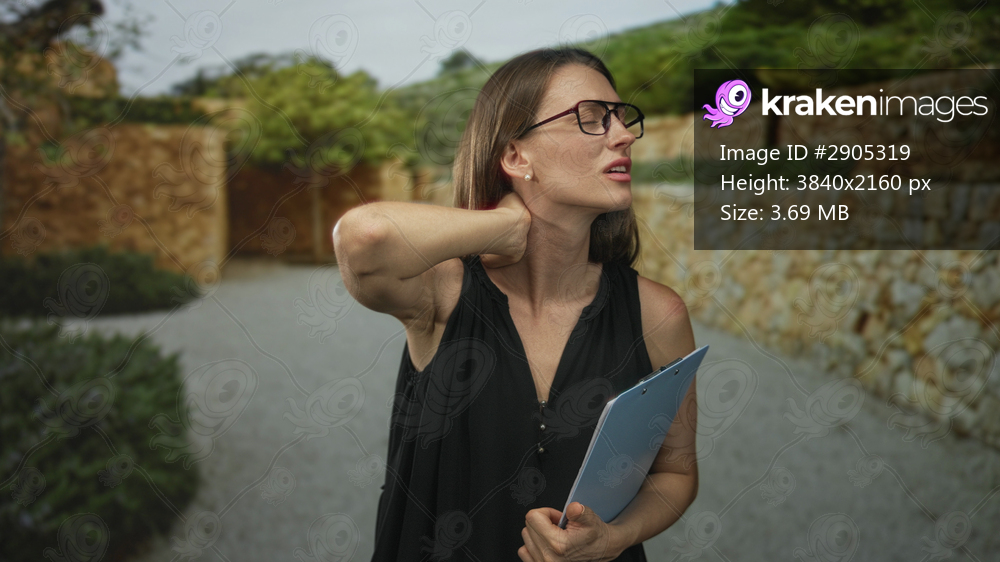 Woman holding clipboard and wearing glasses, hand on neck showing discomfort by the stone entrance of a building outdoors; work fatigue.