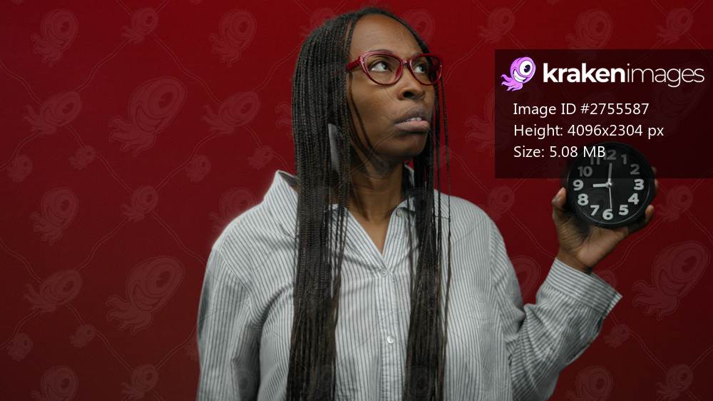Woman holding clock against red background with serious expression wearing glasses and striped shirt conveying time concept visually in close-up shot