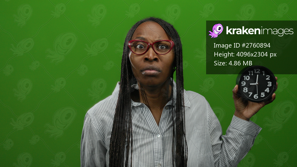 Woman holding clock with glasses against green wall expressing emotion with long hair portraying time concept indoor