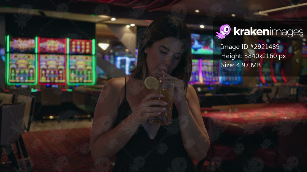 Woman holding cocktail glass, sipping through a straw and smiling, bare shoulders visible in casino; celebration night out.