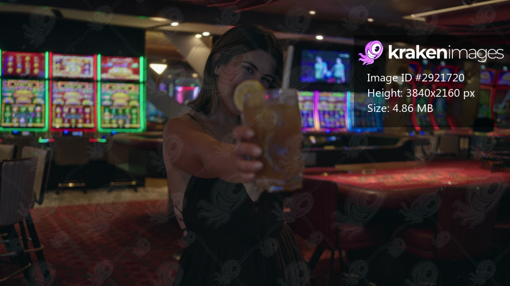 Woman holding cocktail glass, sipping through a straw and smiling, bare shoulders visible in casino; celebration night out.