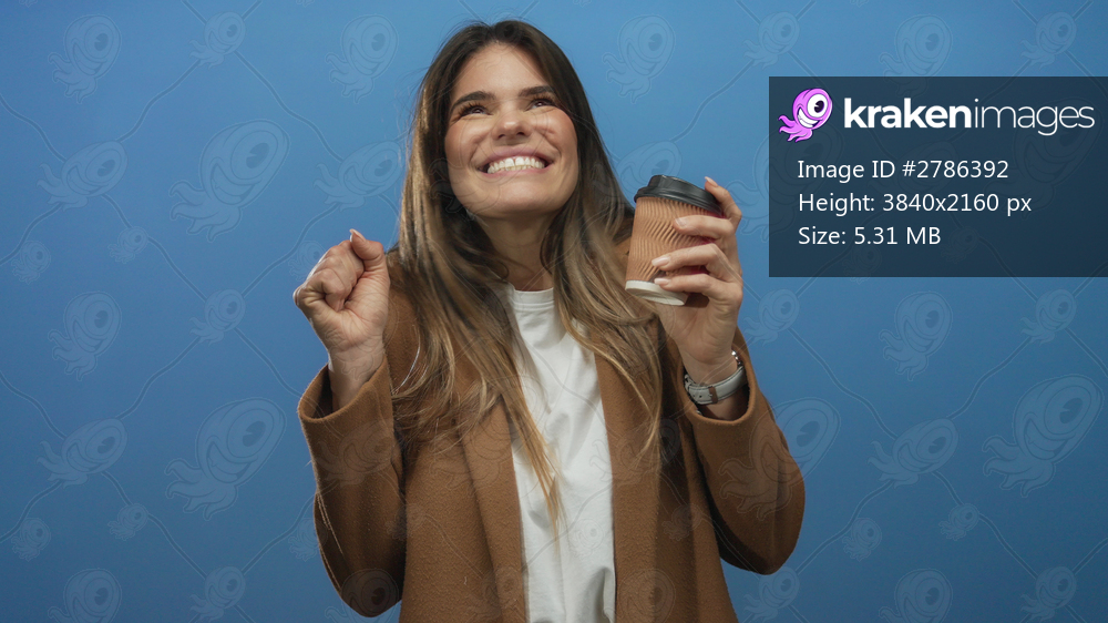 Woman holding coffee cup, celebrating on isolated blue background, embodying energy, excitement, and youthful joy