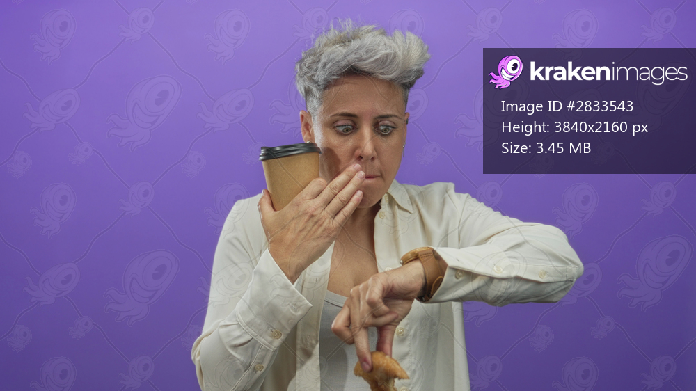 Woman holding coffee cup and flaky croissant while finger pointing to watch in purple studio environment; impatience.