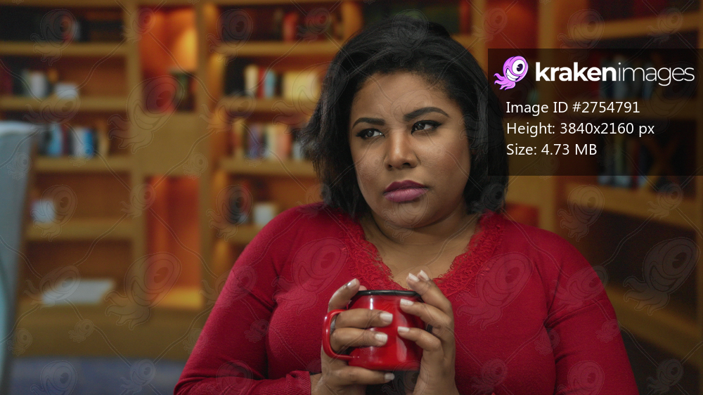 Woman holding coffee cup in cozy library setting, wearing red sweater, plus size, thoughtful, surrounded by wooden bookshelves, indoor environment.