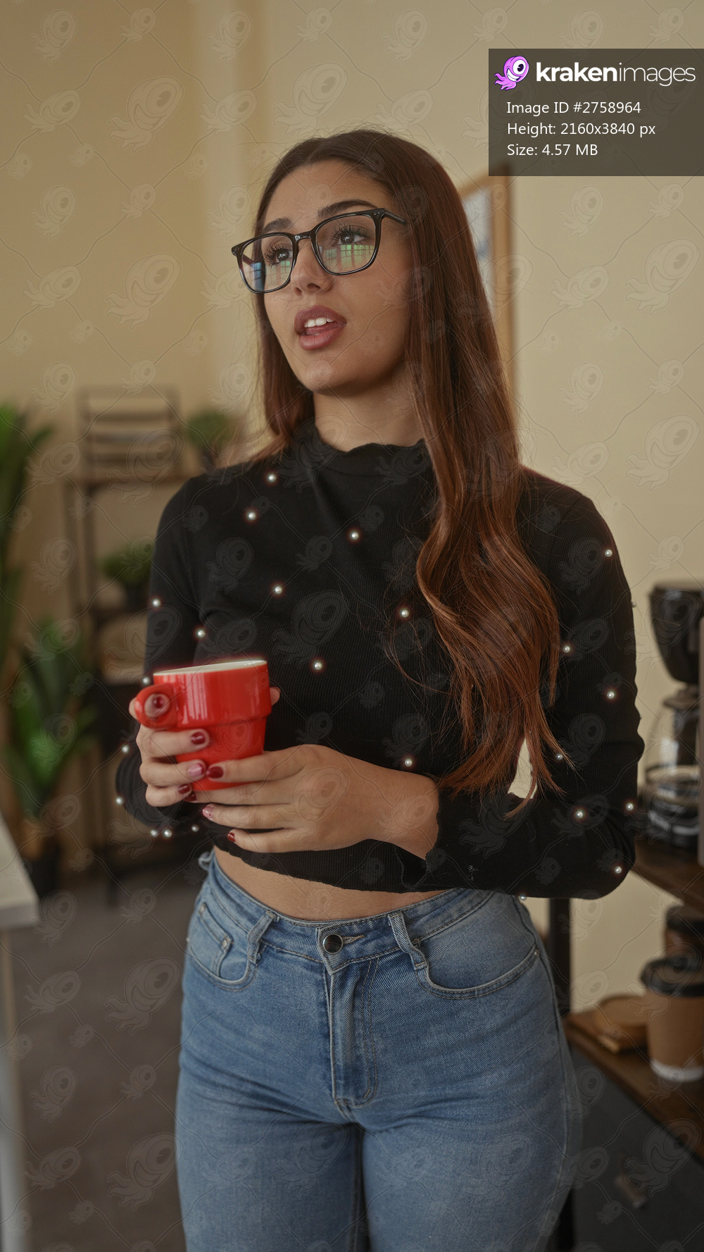 Woman holding coffee cup in office setting wearing glasses and casual attire with indoor plants and coffee machine in the background showcasing a relaxed work environment. - Kraken Images