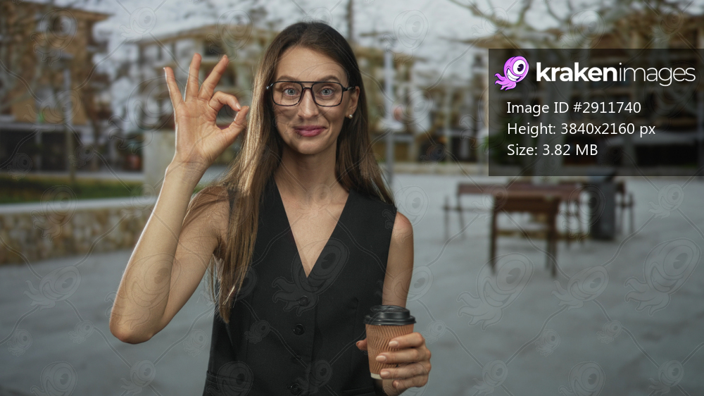 Woman holding coffee cup and making ok sign on street with glasses and sleeveless vest; approval casual warmth.