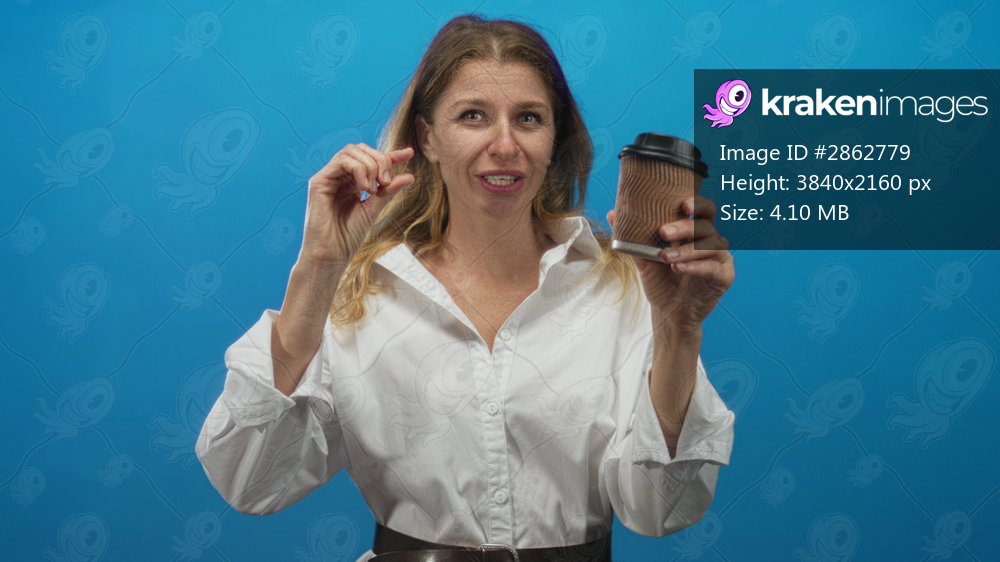 Woman holding coffee cup and pinching fingers to indicate small sip in blue studio; playful tiny sip.