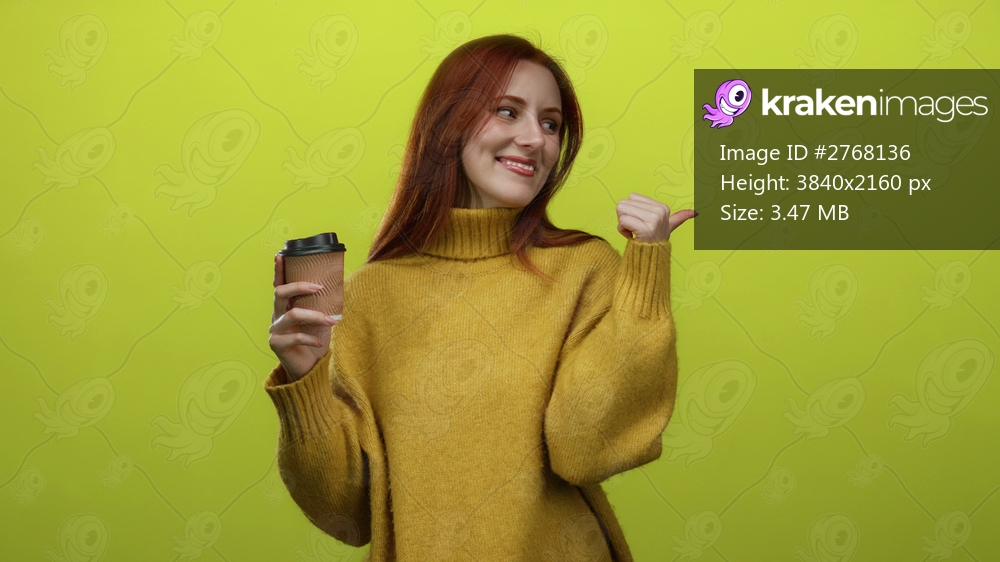 Woman holding coffee cup and pointing to the side with thumb against yellow background wearing cozy sweater showing relaxed expression