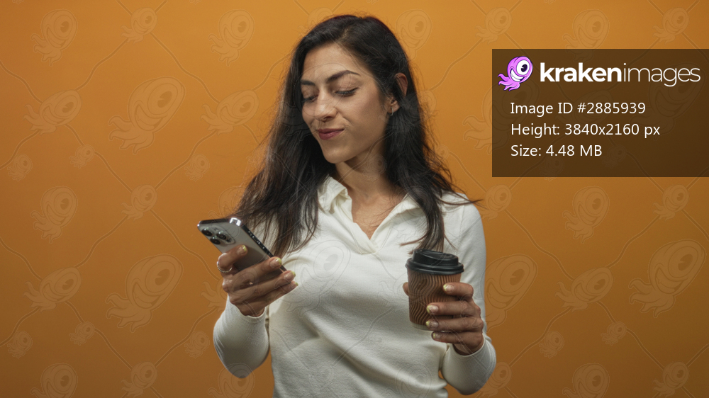 Woman holding coffee cup and smartphone while looking at phone in studio with orange wall; casual contentment.