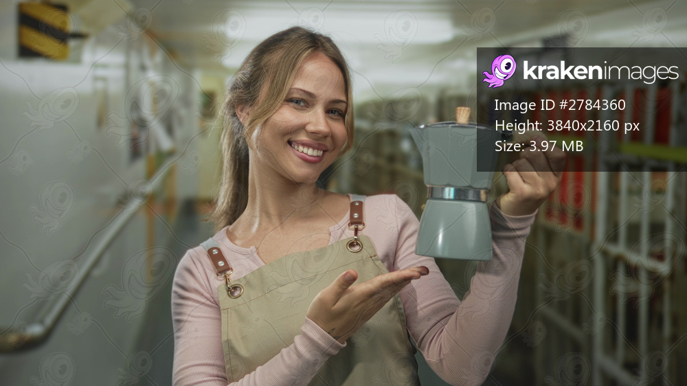 Woman holding coffee pot and pointing at pot in cruise ship corridor; enjoyment hospitality leisure.