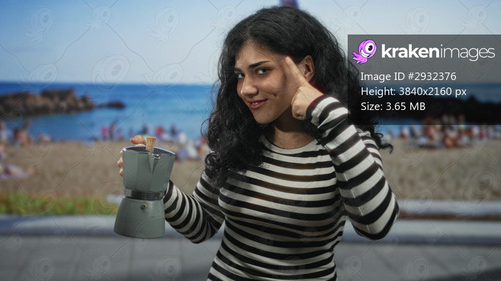 Woman holding coffeemaker points finger to temple at beach while smiling and offering pot; thinking morning thoughtful.