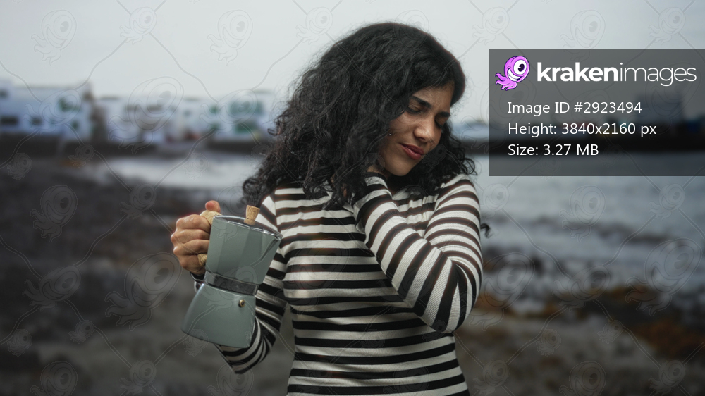Woman holding coffeemaker touches neck at seaside shore while wincing and holding pot handle; discomfort solitude.