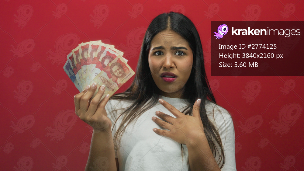 Woman holding colombian pesos with a puzzled expression against a vibrant red background.