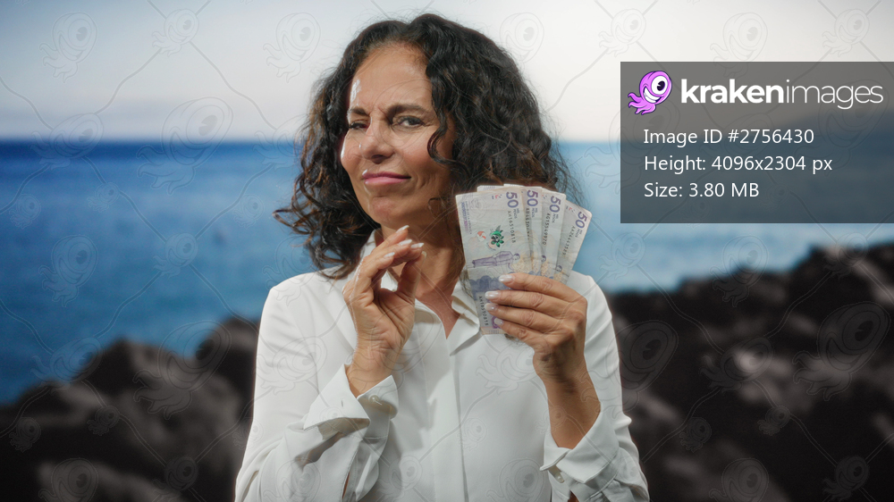 Woman holding colombian pesos on seaside beach displaying middle age contentment with the banknotes against a blue water backdrop