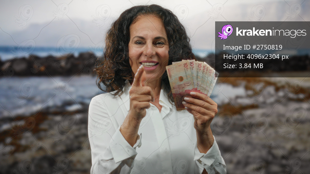 Woman holding colombian pesos smiles by the seaside, showcasing banknotes with the beach and waves in the background.