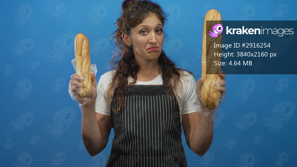 Woman holding and comparing two baguettes with gloved hands while wearing a striped apron in blue studio; quirky doubt bakery humor.