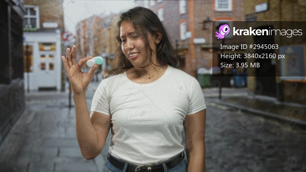 Woman holding contact lens case between fingers on a wet cobblestone street, squinting and grimacing at the small container; hygiene concern disgust.