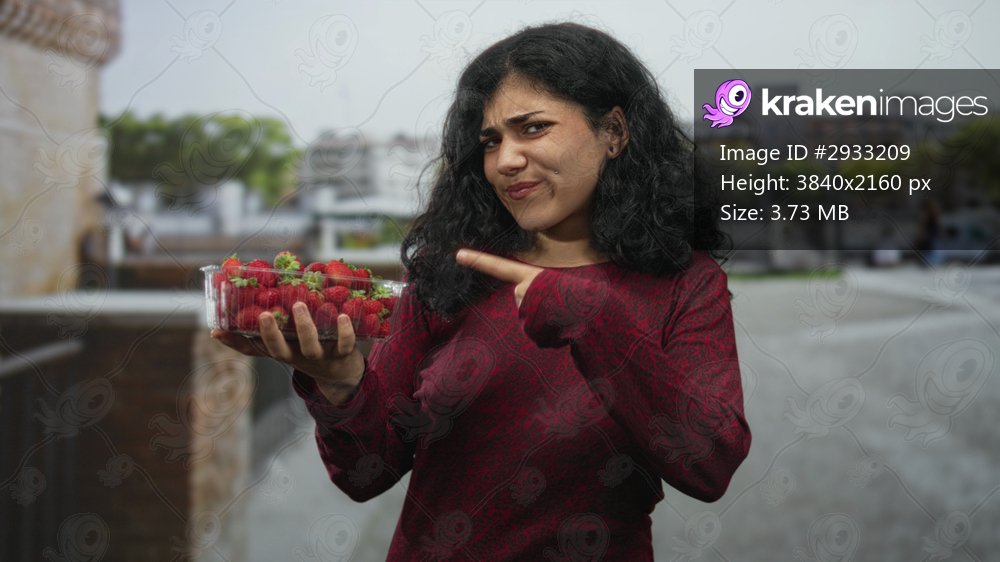 Woman holding container of strawberries and pointing finger on street near building, offering fruit forward with one hand; skepticism.