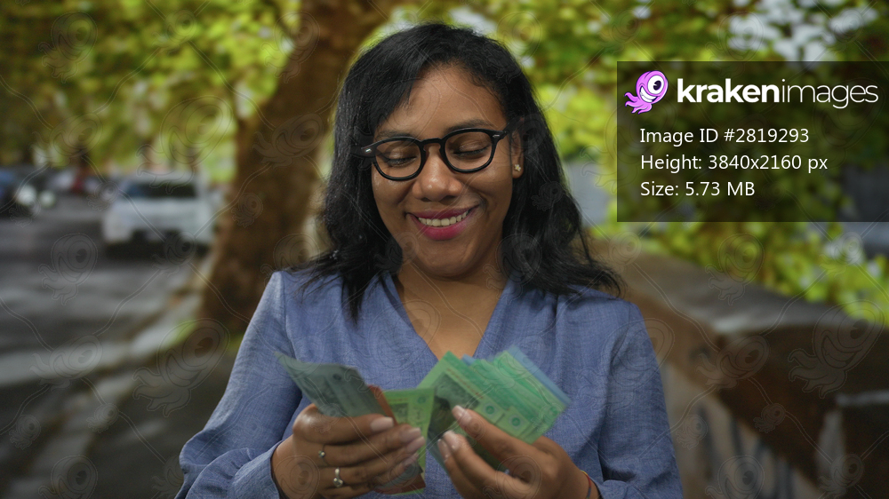 Woman holding and counting green ringgit bills with both hands on city street under trees; prosperity.