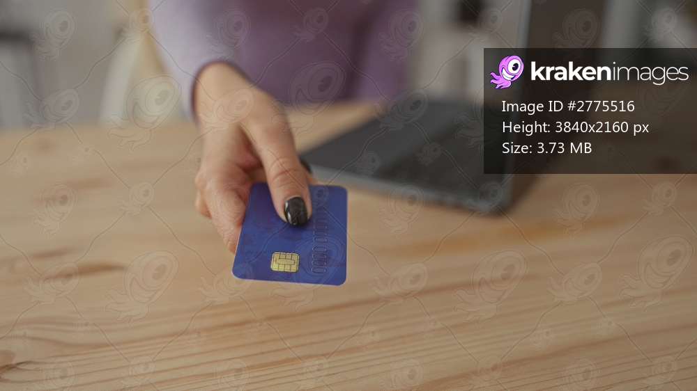 Woman holding credit card in living room while using laptop on wooden table indoors, suggesting secure online shopping or payment in a cozy, modern apartment setting. - Kraken Images