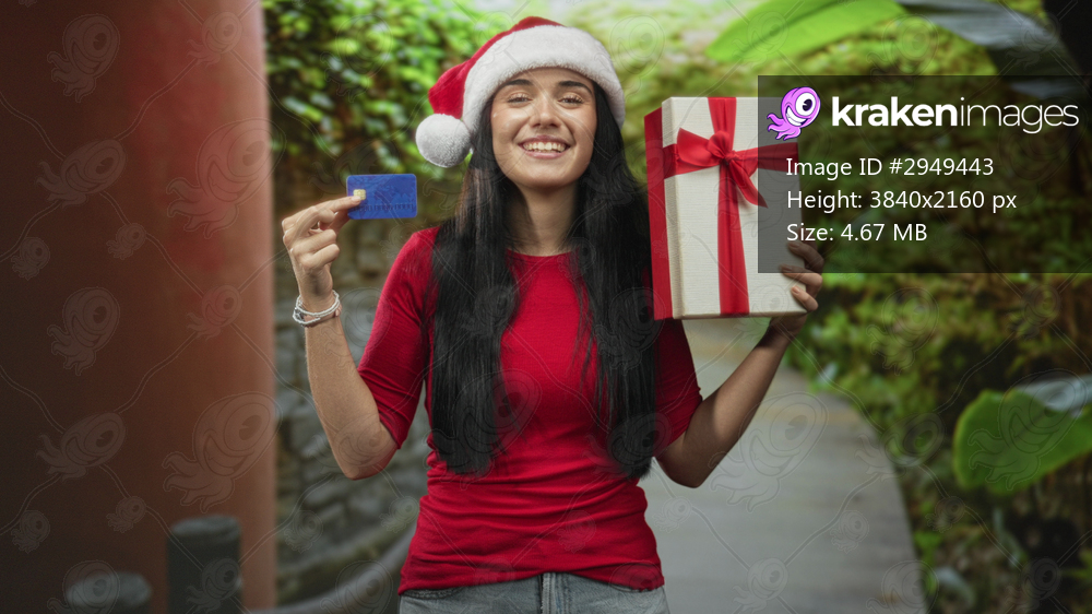 Woman holding creditcard and giftbox, smiling with closed eyes and presenting them while wearing a santa hat on a forest path; giving cheer festive.